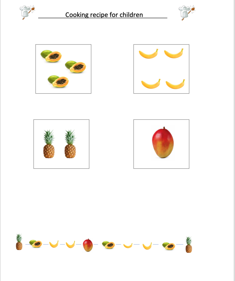 Give the kids a cooking recipe and let them cook! It's an easy recipe to make fruit on a stick. In Belgium, we call it 'fruitsaté'. The cooking recipes are with images of different fruits. They have to count how much to cook. They have to put the fruits on a stick, tell it to the children. Under the recipe, they can find the order of pricking the fruit. You can give pre-cut fruit. But let them try to cut a fruit themselves, and let the children easily cut fruit, such as a banana. Do not be afraid, give the children blunt knives. Tell them that a knife is dangerous and they should use it safely.